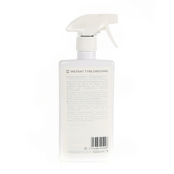Autoglym Instant Tyre Dressing er en rengørende og fornyet dækglans, samtidig med at efterlader en beskyttende lag. Langtidsvirkende dækglans med silikone som giver dækket et frisk udseende og beskytter dem med en naturlig, blank finish.