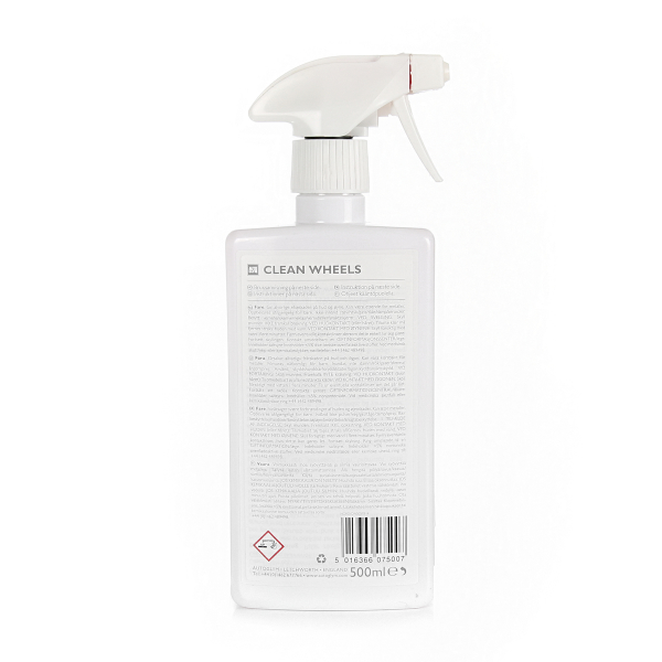 Autoglym Clean Wheelser en effektiv syrebaseret rengøringsmiddel til fælgen. Det opløser snavs, men også til en vis grad bremsestøv og asfaltpletter / tjære. Hvis dine fælge er følsomme overfor syrebaserede rengøringsmidler, bør du overveje at bruge dette middel. For eksempel er der en risiko for at polerede og ubeskyttede fælge ikke tåler syren.