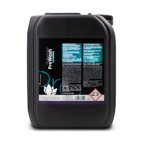 Nanolex Professional PreWash Concentrate er et skumrigt alkalisk forvaskmiddel til bilens udvendige overflader. Formlen er baseret på råmaterialer af høj kvalitet og specielle overfladeaktive stoffer. Den meget kraftfulde rengøringsevne betyder at snavs, trafikfilm, bremsestøv og insektrester opløses hurtigt og effektivt. Professional PreWash Concentrate indeholder specielle antikorrosionsstoffer, hvilket betyder, at produktet uden problemer kan bruges på følsomme materialer som aluminium.