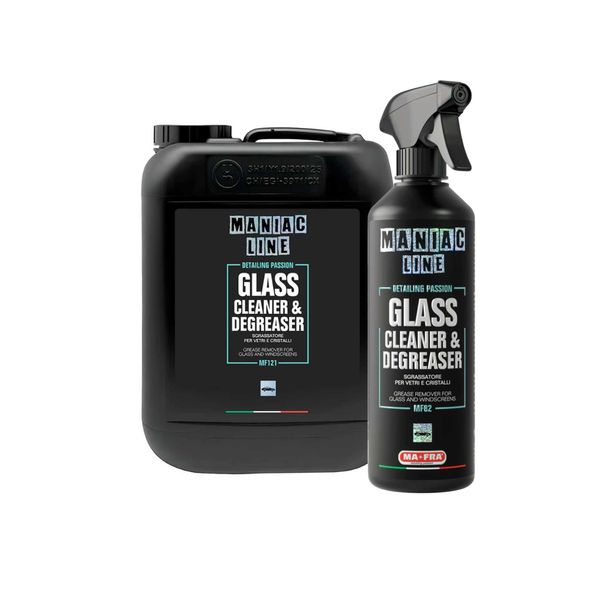 Mafra Maniac Glass Cleaner & Degreaser er en glasrens, der hurtigt og nemt fjerner fedt og genstridigt snavs fra glas. Glass Cleaner & Degreaser er ammoniakfri og vil ikke plette materialer, der kan være i nærheden af glasset, såsom læder, plastik eller alcantara. Midlet tørrer hurtigt og efterlader ingen pletter eller striber. Virker på alle typer glas, også glas med solfilm.