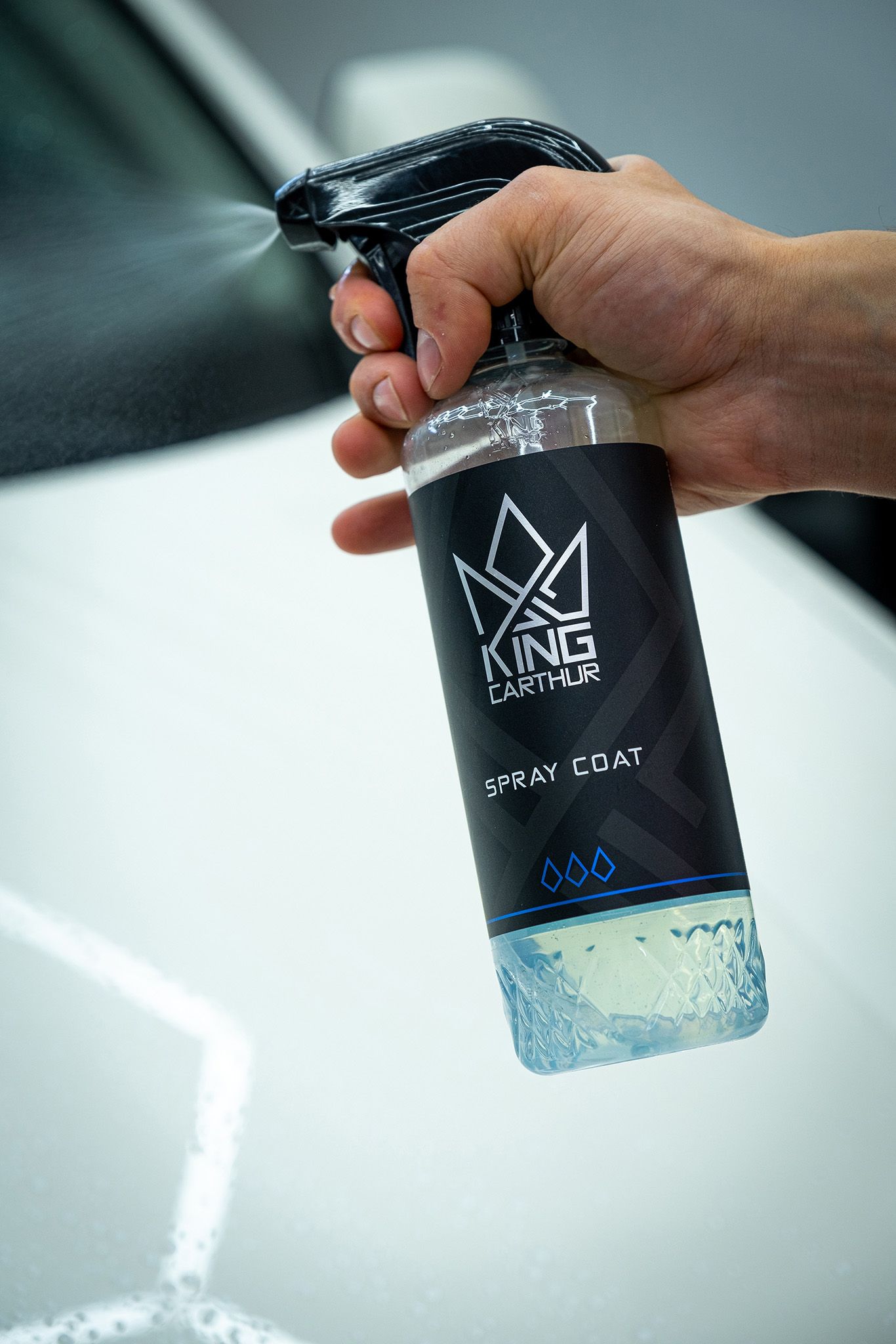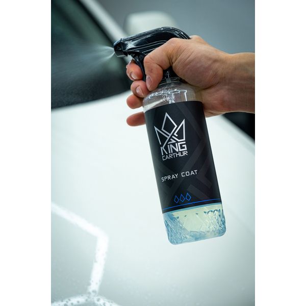 King Carthur Spray Coat er en ekstremt brugervenlig hurtigforsegling som kan bruges på alle køretøjets udvendige overflader! Midlet kræver ingen aftørring, men sprayes direkte på en våd og ren overflade og skylles derefter af. Den binder sig til overfladen direkte efter skylning og skaber en vandafvisende beskyttelsesfilm som effektivt frastøder vand og snavs. Derudover forbedre Spray Coat lakoverfladens glans, og den vandafvisende effekt gør rengøringen meget lettere! Udover lakoverfladen fungerer Spray Coat også på alle andre udvendige overflader som fælg, glas, plast, gummi og endda folierede overflader. Producenten lover en holdbarhed på op til tre måneder!