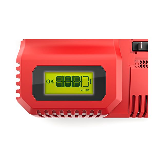 Hurtigoplader til Flex 12V og 18,0V batterier. Det intelligente LCD-display viser f.eks. opladningsstatus og batteriets tilstand.