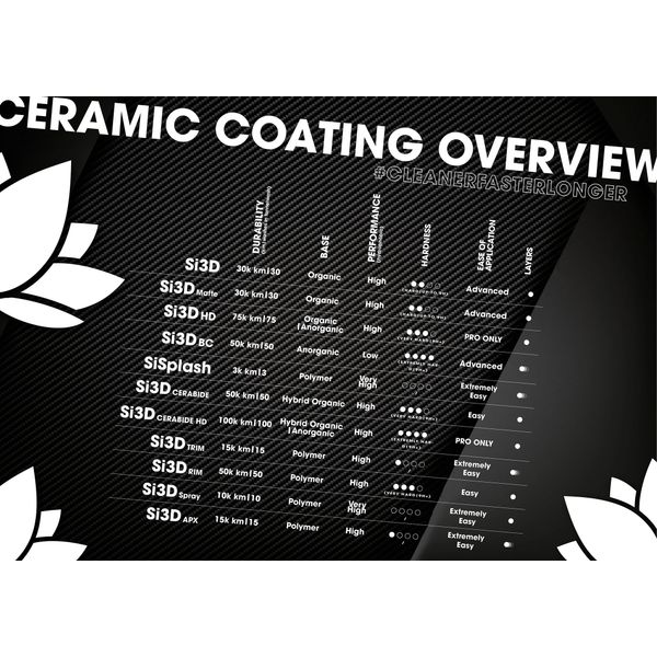Si3D indeholder ikke opløsningsmiddel og flour. Lakforseglingen er meget hård og øger lakkens slidstyrke. Nanolex Si3D skaber en langvarig beskyttelse mod kemikalier og kraftig mekanisk slid. Producenten lover en holdbarhed på op til 24 måneder / 30.000 km, “så længe bilen ikke vaskes ofte, med midler som har alt for høj pH-værdi eller udsættes for urimelig mekanisk slid”.