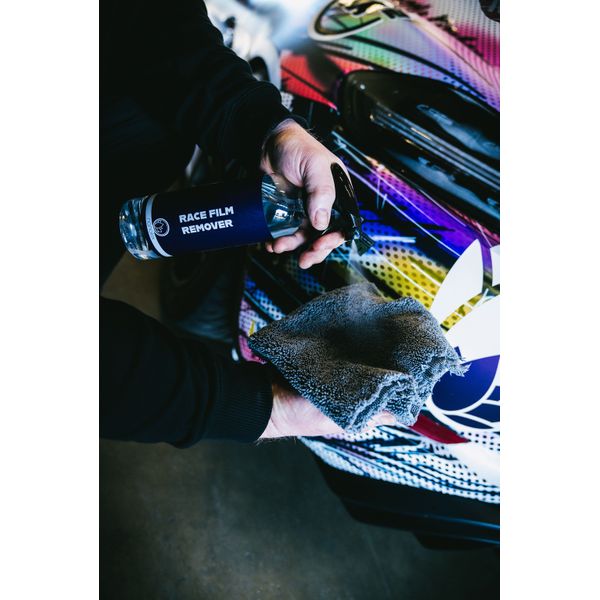 Produktet skal ikke skylles af, men kan tørres af med en mikrofiberklud. Race Film Remover fordamper uden at efterlade spor.