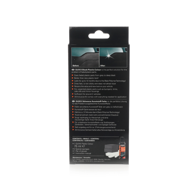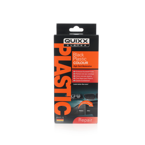 Quixx Black Plastic Colour er et komplet sæt, som anvendes til at give de sorte plastik detaljer sin dybe sorte farve tilbage. Med årene slides plastikken og bliver matte, solblegede og får en grålig tone. Med Quixx BT-teknik (Black Polymer Technology) får du enkelt den dybe farve tilbage og får detaljerne til at se helt nye ud! Den højpræsterende snavsafvisende UV-beskyttelse giver plast detaljerne en god beskyttelse i op til 12 måneder.