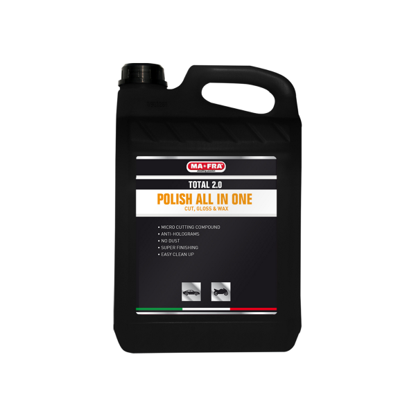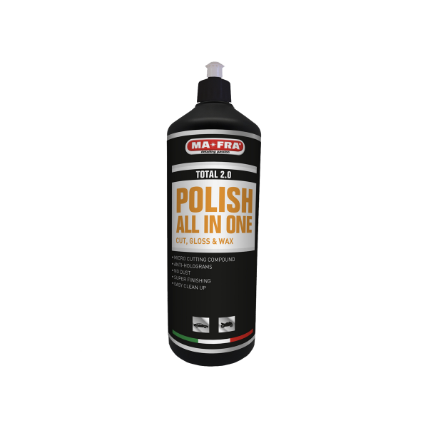 Mafra Polish Total 2.0 er et alsidigt vandbaseret polermiddel til polering i ét trin, der fjerner mellemstore og kraftige ridser og giver lakken en fin glans. Polish Total 2.0 indeholder ingen silikoner eller fyldstoffer. Kan bruges på både bløde og hårde lak.